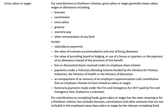 A: Superannuation (an agreed scheme) and or KiwiSaver? Both are based on the taxable gross and annual leave and any other type of taxable paid leave agreed or by law are part of the employee taxable gross earnings that super or KiwiSaver are based on.